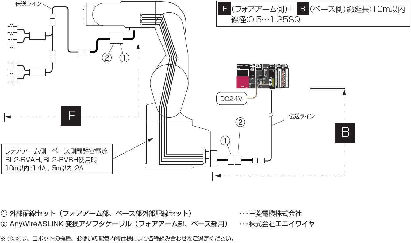 DP-DN許容供給電流や、接続方法などはロボットの機種によって異なりますので、詳細はお問い合わせください。